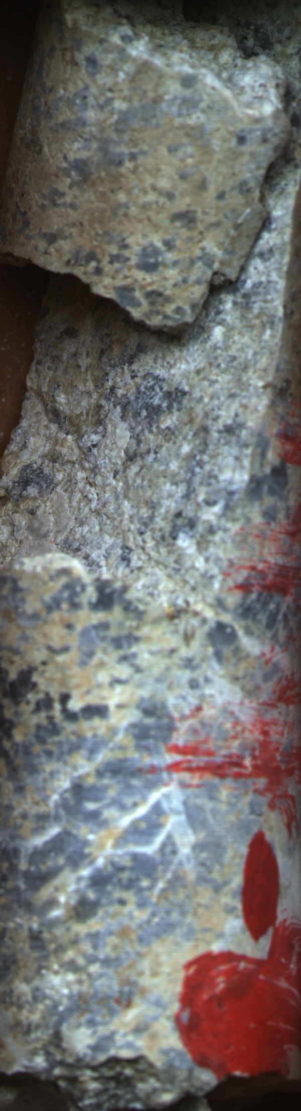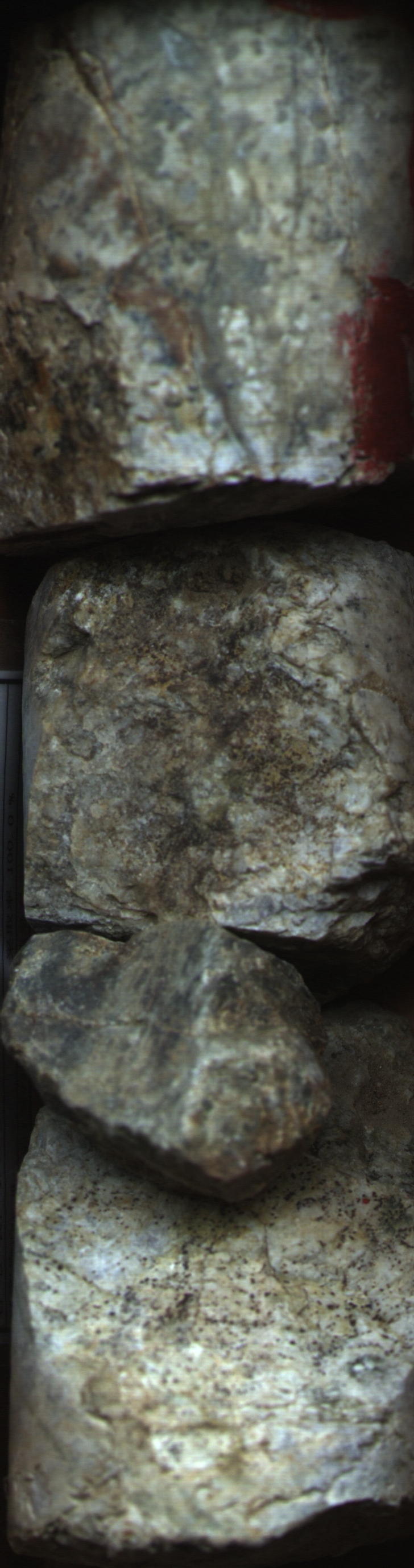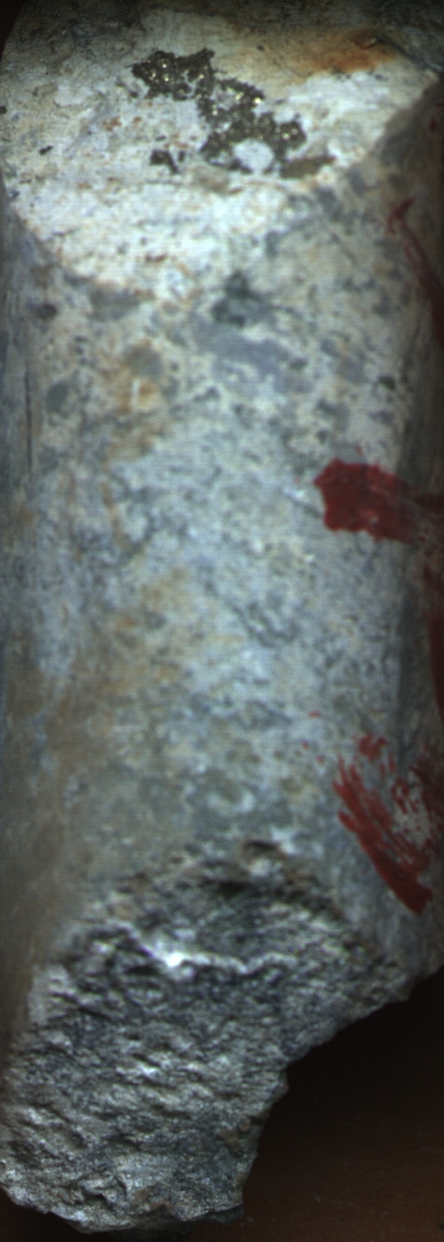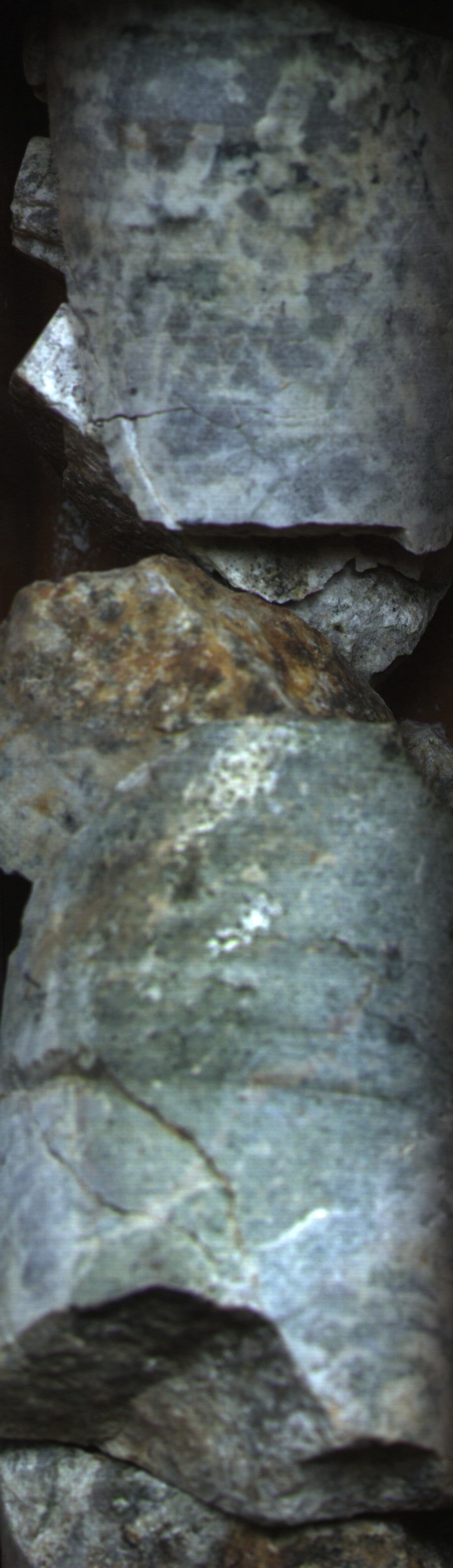 | 379.41 | 382.73 | 混合岩 | 灰黑色,岩石裂隙发育,晶洞内有方解石晶簇。岩石具绿泥石化,见有磁黄铁矿。 |