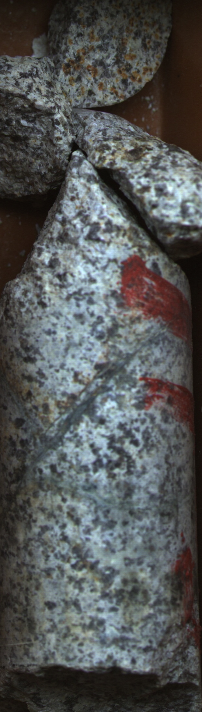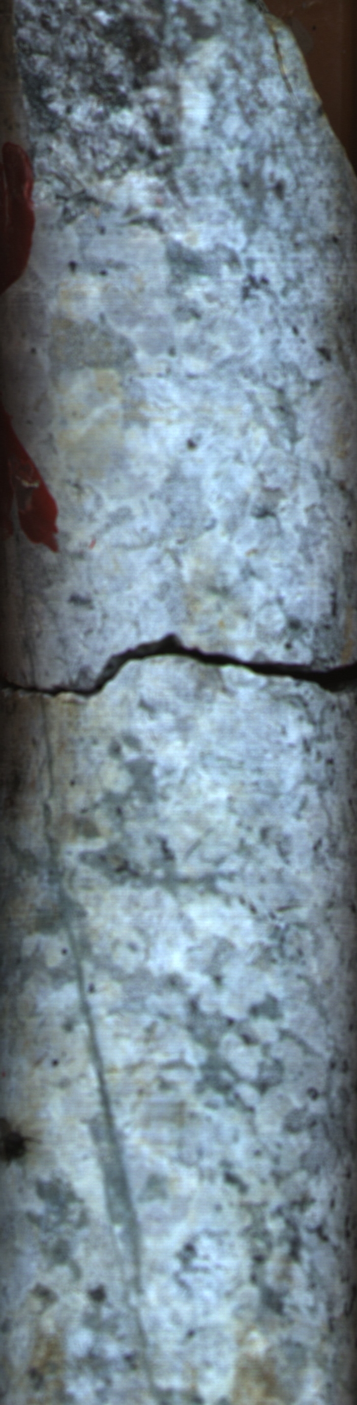 | 423.91 | 444.65 | 混合花岗岩 | 灰色至灰黑色中细粒结构,块状构造,矿物成份为长石、石英及黑云母。423.91-428.42m岩段岩石破碎,裂隙中充填方解石脉,431.72-434.51m处岩石破碎,并见有黄铁矿化、黄铜矿化。 |