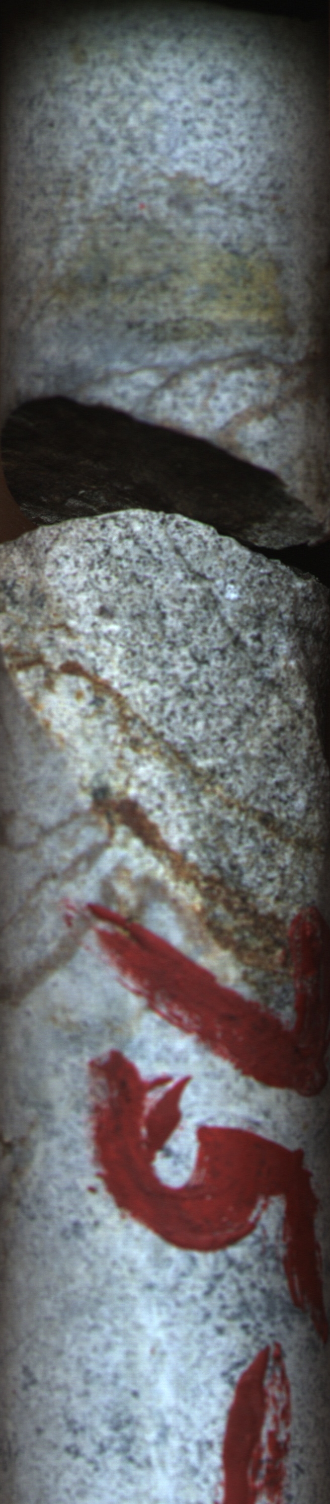 | 347.99 | 357.33 | 混合岩 | 灰黑色,岩石裂隙发育,晶洞内有方解石晶簇。岩石具绿泥石化,见有磁黄铁矿。 |